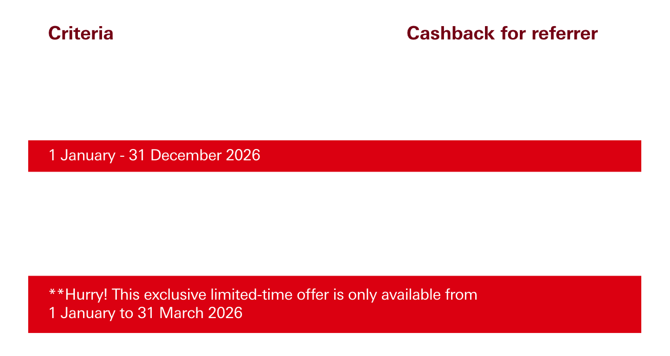 1HSBC/HSBC Amanah Mortgage Refinancing Reward Campaign 2025/2026 Terms and Conditions apply. 2HSBC/HSBC Amanah Zero Moving Cost Campaign 2026 Terms and Conditions apply. Eligible customers are entitled to the Zero Moving Cost package, capped at RM50,000 and with a 5-year lock-in period. 3HSBC Bank/HSBC Amanah Mortgage Member-Get-Member (MGM) Campaign 2025/2026 Terms and Conditions apply. Referral Period from 3 December 2025 to 31 March 2026 and Successful Referral Period from 3 December to 30 June 2026.
